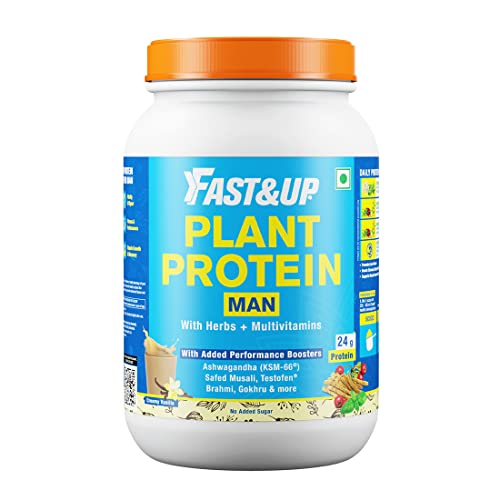 Details: Packed With Plant Power, Fast&Up Plant Protein for Man is formulated with well-researched and high-quality plant protein with superherbs and multivitamins carefully designed for man’s that helps improve metabolism, energy, testosterone levels, strength, stamina, vitality, vigour, lean muscle mass and overall health. Plant Protein for Man consist of 3 well-planned and high-quality blends – Green Blend, Ayurvedic Energizing Blend and Multivitamin Blend. With combination Pea + Brown Rice Protein Isolate, that helps to fulfil daily protein requirements, supports muscle strength, endurance, toned, lean muscle and recovery. Green Blend consists of 100% natural and superfoods such as wheatgrass powder, chlorella powder and moringa powder that helps to eliminate toxins, boosts metabolism, aids digestion and strengthens immune system. Energizing blend comprises of ayurvedic herbs such as ashwagandha (KSM-66), gokhru, safed musali, fenugreek, brahmi and black pepper extract, which are rich in nutrient profile. Vitamin and Mineral blend consist of essential nutrients which are important for daily health such as B-Complex with B12, Vitamin C, D3, Zinc, Iron and Electrolytes that help you bridge daily nutrition gap, keeps you active and energetic throughout the day.