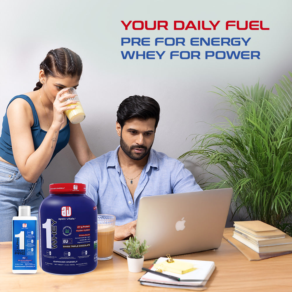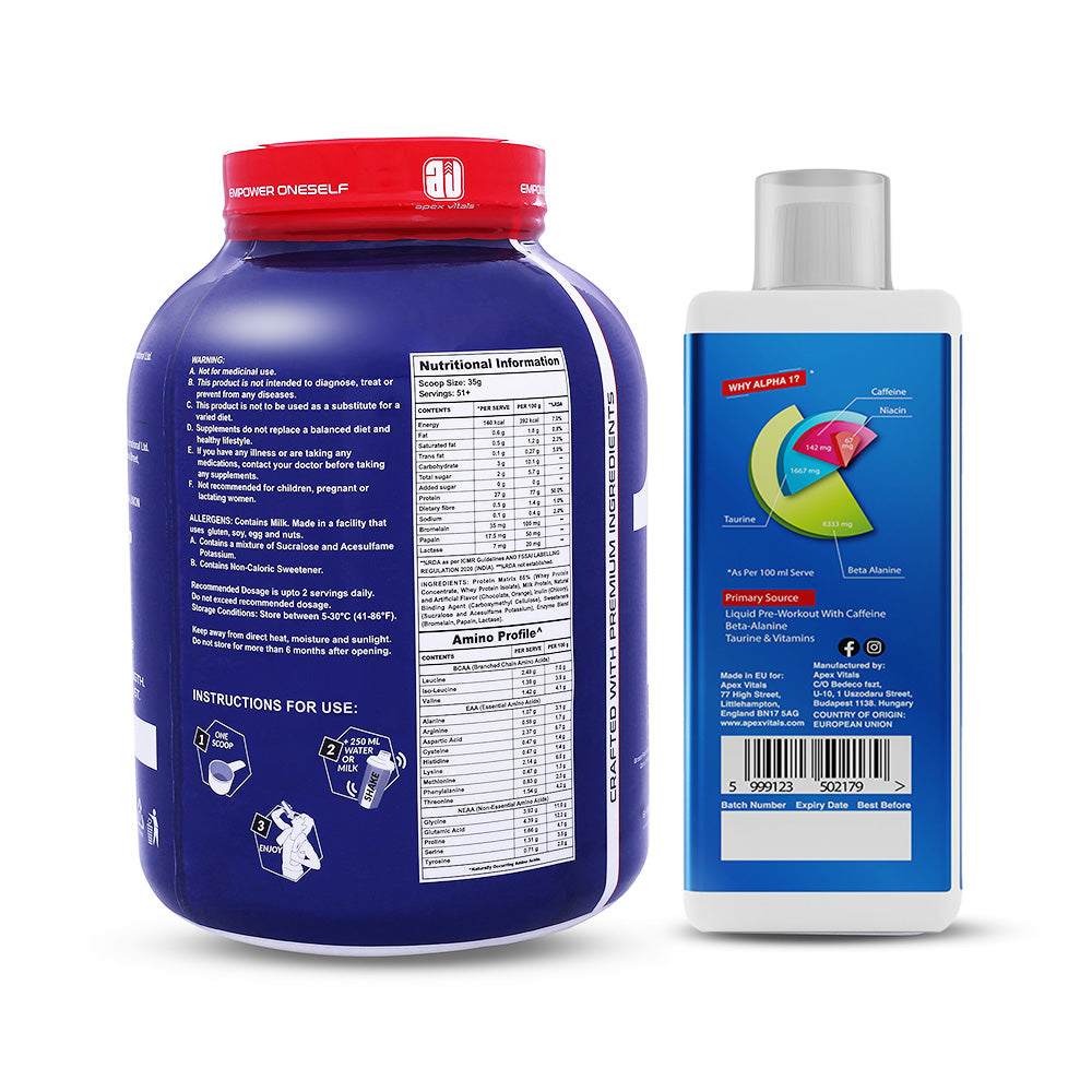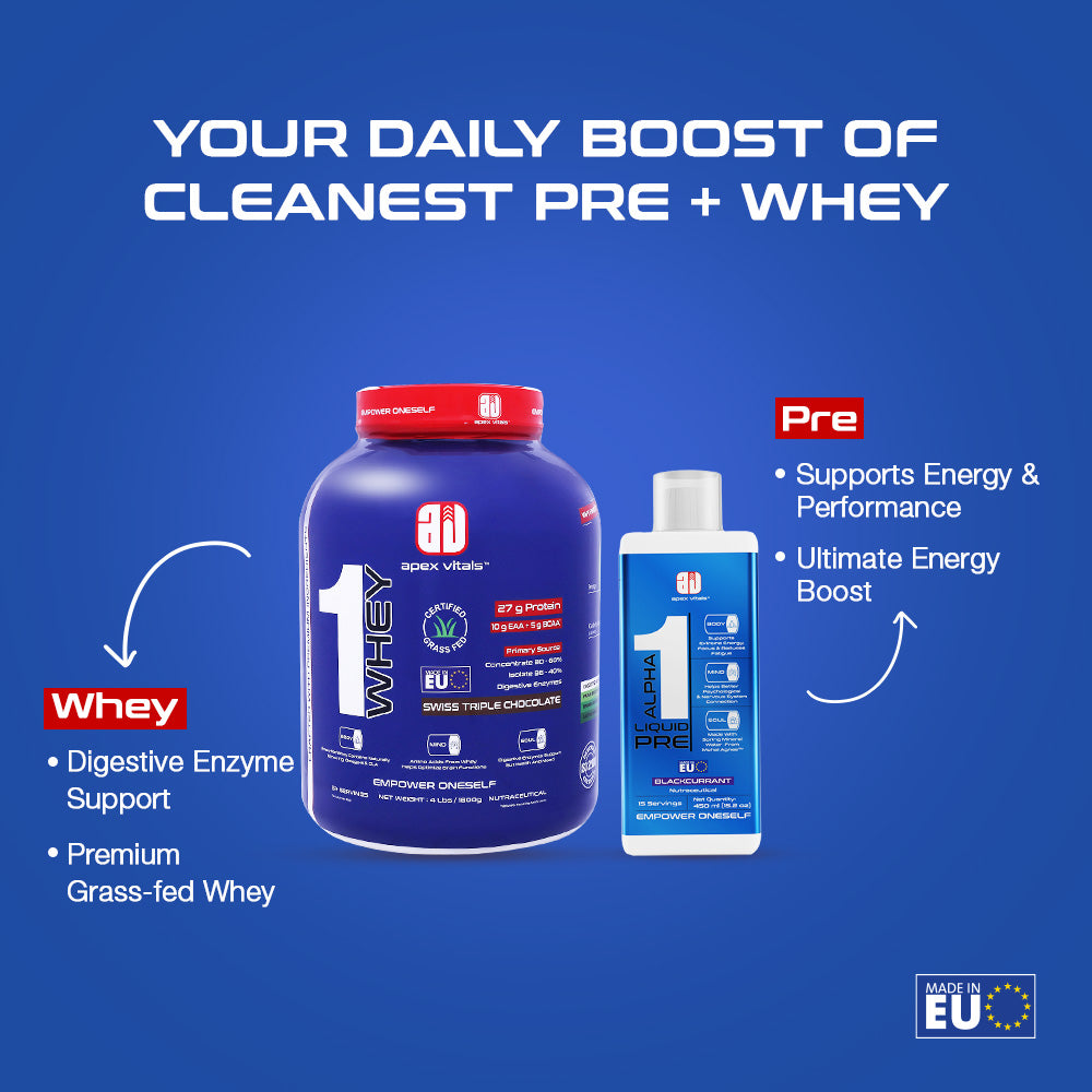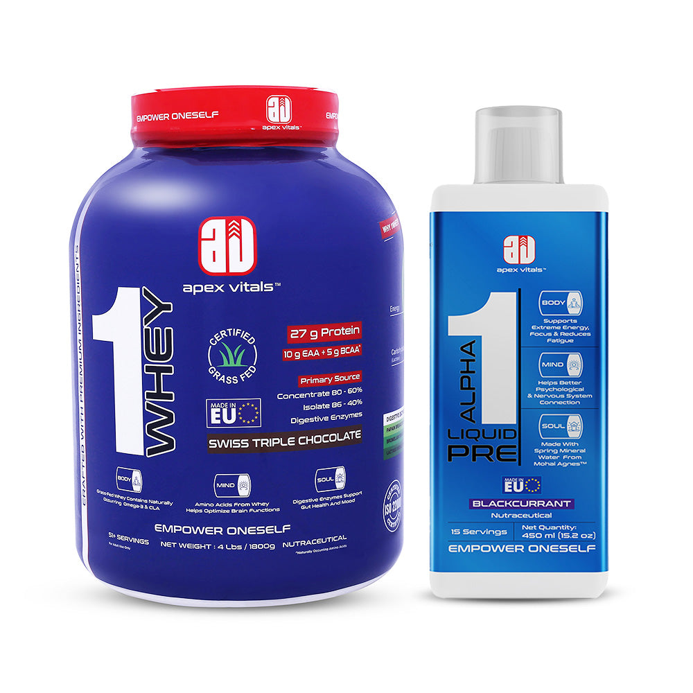 Apex Vitals - 1 Whey Protein Blend 4 lbs + Alpha 1 Pre-Workout Combo | Grass-Fed Protein Powder | Mohai Ignes Mineral Water | Muscle Strength & Recovery | Swiss Triple Chocolate (4lbs)