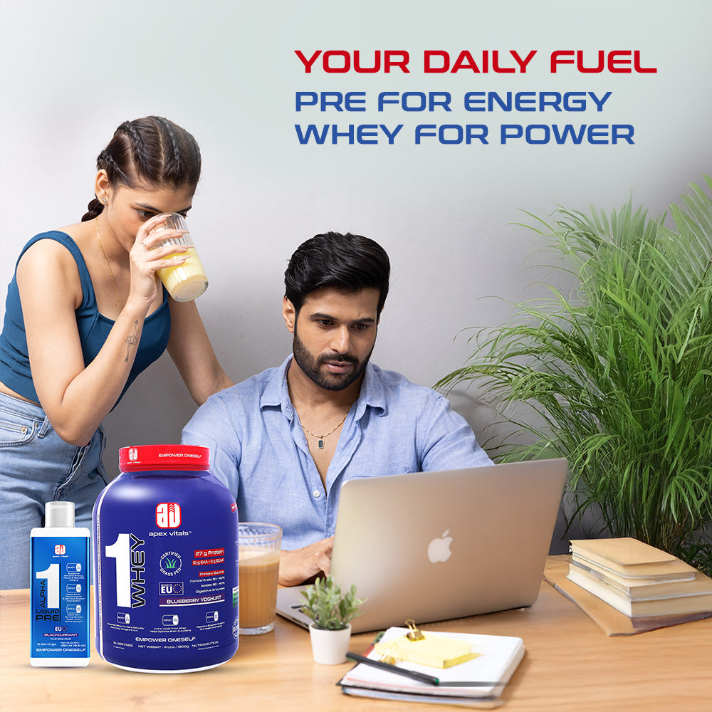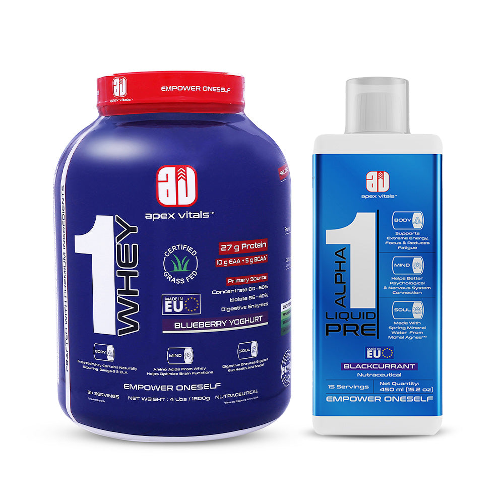 Apex Vitals - 1 Whey Protein Blend 4 lbs + Alpha 1 Pre-Workout Combo | Grass-Fed Protein Powder | Mohai Ignes Mineral Water | Muscle Strength & Recovery | Blueberry Yoghurt (4lbs)