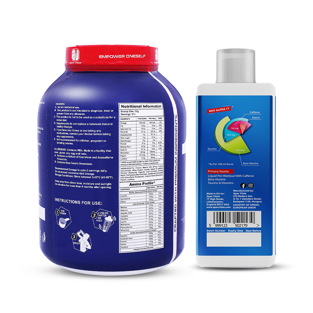 This performance-packed combo blends a premium grass-fed whey protein with a high-potency pre-workout formula—both crafted in the European Union. The whey protein offers a clean, rich-tasting blend of concentrate and isolate, enhanced with digestive enzymes to boost absorption, reduce soreness, and promote lean muscle growth. The pre-workout, a ready-to-drink energizer, delivers a powerful mix of ingredients like caffeine, beta-alanine, and citrulline, backed by natural spring water for hydration. Together, they help amplify strength, accelerate recovery, and fuel both body and mind—whether you're lifting weights or heading outdoors. Suitable for all fitness journeys.