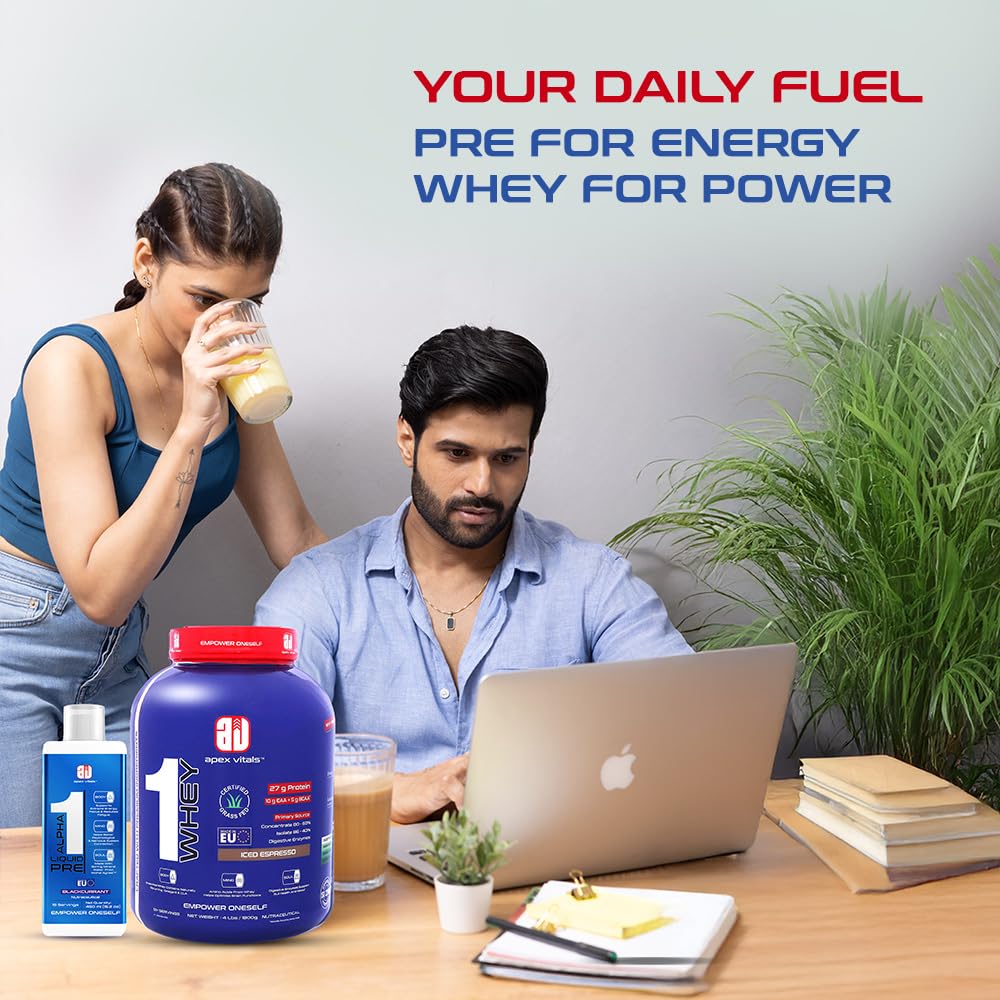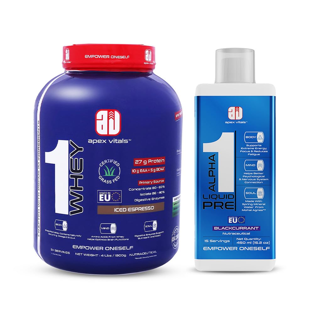 Apex Vitals - 1 Whey Protein Blend 4 lbs + Alpha 1 Pre-Workout Combo | Grass-Fed Protein Powder | Mohai Ignes Mineral Water | Muscle Strength & Recovery | Iced Espresso (4lbs)