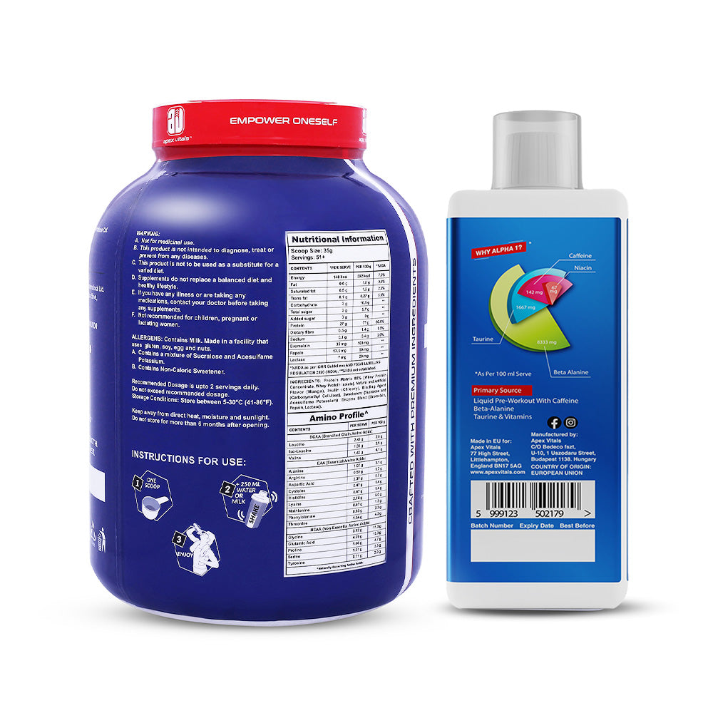 This performance-packed combo blends a premium grass-fed whey protein with a high-potency pre-workout formula—both crafted in the European Union. The whey protein offers a clean, rich-tasting blend of concentrate and isolate, enhanced with digestive enzymes to boost absorption, reduce soreness, and promote lean muscle growth. The pre-workout, a ready-to-drink energizer, delivers a powerful mix of ingredients like caffeine, beta-alanine, and citrulline, backed by natural spring water for hydration. Together, they help amplify strength, accelerate recovery, and fuel both body and mind—whether you're lifting weights or heading outdoors. Suitable for all fitness journeys.
